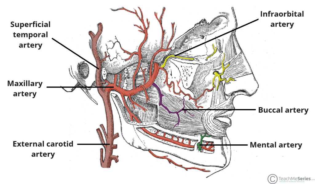 The human face extends from the forehead (superiorly) to the chin (inferiorly) and contains the eyes, nose, and mouth. It receives a rich arterial supply derived four main vessels: Facial artery Superficial temporal artery Maxillary artery Ophthalmic artery In this article, we shall look at the anatomy of the arterial supply to the face – the distribution of vessels, their branches and any clinical correlations. Pro Feature - 3D Model You've Discovered a Pro Feature Access our 3D Model Library Explore, cut, dissect, annotate and manipulate our 3D models to visualise anatomy in a dynamic, interactive way. Learn More Facial Artery The facial artery is the fourth major branch of the external carotid artery. It arises within the carotid triangle of the neck. After its origin, the facial artery ascends – travelling superiorly and obliquely across the posterior surface of the submandibular gland. It then curves over the anterior aspect of the body of the mandible, before travelling along the inferior border of the masseter muscle. The facial artery then moves deep to the muscles of facial expression and gives rise to numerous branches. It terminates as the angular artery within the nasolabial fold. Branches The facial artery supplies structures in both the head and neck. The specific branches that supply structures of the face include: Superior and inferior labial artery – supply the upper and lower lips. Lateral nasal artery – supplies the external nose. Angular artery – supplies the external nose, lower eyelid, orbicularis oculi and lacrimal sac. By TeachMeSeries Ltd (2026) Fig 1Anatomical course of the facial artery. Superficial Temporal Artery The superficial temporal artery is a terminal branch of the external carotid artery. It arises within the substance of the parotid gland, at the level of mandibular neck. Within the parotid gland, the artery gives rise to the transverse facial artery. It then travels superiorly, passing anterior to the external ear and over the zygomatic arch. The superficial temporal artery terminates within the temporal fossa on the lateral aspect of the skull by dividing into frontal and parietal branches. Branches The superficial temporal artery supplies structures of the face via numerous branches: Transverse facial artery – supplies the parotid gland and duct, orbicularis oris muscle, and masseter muscle. Middle temporal artery – supplies the temporalis muscle. Zygomatico-orbital artery – supplies the orbicularis oculi muscle. Anterior auricular artery – supplies the external ear. Parietal terminal branch – supplies the structures of the parietal scalp. Frontal terminal branch – supplies the structures of the lateral forehead. By TeachMeSeries Ltd (2026) Fig 2Branches of the superficial temporal artery Maxillary Artery The maxillary artery is a terminal branch of the external carotid artery. It arises within the substance of the parotid gland and passes forward to enter the infratemporal fossa. It passes through the infratemporal fossa, exiting via the pterygomaxillary fissure and entering the pterygopalatine fossa. Branches The maxillary artery supplies numerous (usually deep) structures in the head. The specific branches that supply structures of the face include: Infraorbital artery – supplies the lateral nose, cheek and upper lip. Buccal artery – supplies the cheek and buccinator muscle. Mental artery – supplies the skin and muscles of the chin region. By TeachMeSeries Ltd (2026) Fig 3Branches of the maxillary artery to the face. Ophthalmic Artery The ophthalmic artery is the first main branch of the internal carotid artery. It primarily supplies structures related to the orbit. It has an intracranial origin, arising as the internal carotid artery leaves the cavernous sinus. It enters the bony orbit via the optic canal and gives rise to numerous arteries which supply the eye and surrounding structures. It terminates by dividing into the supratrochlear artery and dorsal nasal artery. Branches The ophthalmic artery gives rise to numerous vessels that supply the eye and surrounding structures. The branches that supply structures of the face include: Supraorbital artery – supplies skin, muscles and periosteum of the forehead. Supratrochlear artery – supplies skin, muscles and periosteum of the forehead. Dorsal nasal artery – supplies the nasolacrimal sac and external nose. Zygomatico-facial artery – supplies the upper cheek. Do you think you’re ready? Take the quiz below Pro Feature - Quiz The Arterial Supply to the Face Question 1 of 3 Submitting... Skip Next Rate question: You scored 0% Skipped: 0/3 1800 More Questions Available Upgrade to TeachMeAnatomy Pro Challenge yourself with over 1800 multiple-choice questions to reinforce learning Learn More Rate This Article