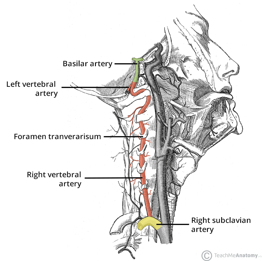 The Vertebral Artery - Podcast Version TeachMeAnatomy 0:00 / 0:00 1x 0.25x 0.5x 0.75x 1x 1.25x 1.5x 1.75x 2x The vertebral artery is one of a pair of vessels that forms a crucial component of the arterial supply to the brain. Together, the vertebral arteries contribute to the posterior circulation – supplying the brainstem, cerebellum and posterior aspects of the cerebrum. In this article, we shall examine the anatomy of the vertebral artery – its course, supply and clinical relevance. Pro Feature - 3D Model You've Discovered a Pro Feature Access our 3D Model Library Explore, cut, dissect, annotate and manipulate our 3D models to visualise anatomy in a dynamic, interactive way. Learn More Course The vertebral artery arises from the first part of the subclavian artery within the root of the neck. It ascends superiorly through the neck by passing through the transverse foramina of the cervical vertebrae (typically C6–C1). During this part of its course, it gives rise to small spinal and muscular branches, which supply surrounding structures. After exiting the transverse foramen of C1, the artery passes posteromedially within the suboccipital triangle, looping posteriorly around the lateral mass of the atlas. The vertebral artery then enters the cranial cavity via the foramen magnum. Here, it runs along the anteromedial surface of the medulla oblongata. During its intracranial course, several key branches arise: Posterior inferior cerebellar artery Posterior spinal artery Anterior spinal artery At the junction of the medulla and pons (the pontomedullary junction), the vertebral artery terminates by uniting with its contralateral counterpart to form the basilar artery. By TeachMeSeries Ltd (2026) Fig 1Course of the vertebral artery within the neck. Biodigital Human 2016 Fig 2The suboccipital triangle. It can be used to locate the vertebral artery, as shown on this illustration. Supply The vertebral artery supplies the following structures through its branches: Anterior and posterior spinal arteries – supply the superior spinal cord. Posterior inferior cerebellar artery – supplies the cerebellum and lateral medulla oblongata. Medullary branches – supply the medulla oblongata. Meningeal branches – supply the dura mater. Basilar artery – contributes to the supply of the posterior cerebrum. Clinical Relevance Vertebral Artery Dissection A vertebral artery dissection is a tear in the inner lining of the vessel, allowing blood to track within the arterial wall. This can result in luminal narrowing, thrombus formation and subsequent ischaemia of posterior circulation structures. The vertebral artery is particularly vulnerable where its course is tortuous and mobile. After exiting the transverse foramen of C1, it lies within the suboccipital triangle – where it is susceptible to stretching and injury during neck rotation and extension. Dissection may also occur following cervical spine trauma, particularly fractures involving the transverse foramina. Patients typically present with neck pain or occipital headache, followed by features of posterior circulation stroke, such as dizziness, ataxia or visual disturbance. Do you think you’re ready? Take the quiz below Pro Feature - Quiz The Vertebral Artery Question 1 of 3 Submitting... Skip Next Rate question: You scored 0% Skipped: 0/3 1800 More Questions Available Upgrade to TeachMeAnatomy Pro Challenge yourself with over 1800 multiple-choice questions to reinforce learning Learn More Rate This Article