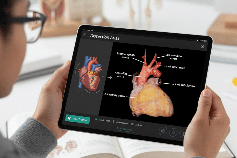 The Dissection Atlas links textbook diagrams to real human anatomy. Photographs are integrated throughout the platform, helping students and educators bridge the gap between digital study and hands-on dissection.